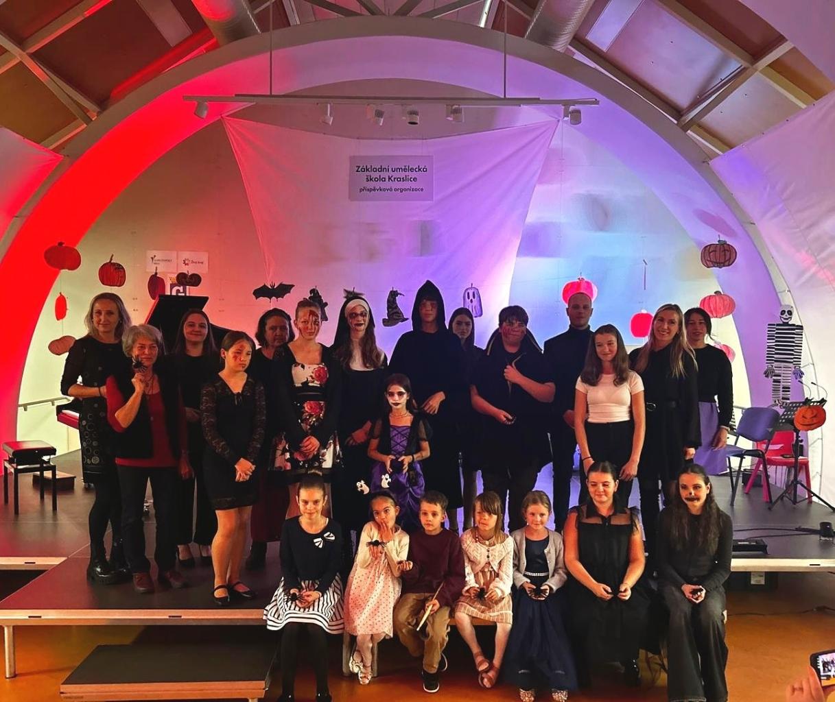 Výtvarný obor se postaral o dokonalou výzdobu, dramatický obor příjemně postrašil a hudební i taneční obor rozzářily pódium svými vystoupeními, pro některá strašidýlka to bylo první veřejné vystoupení.