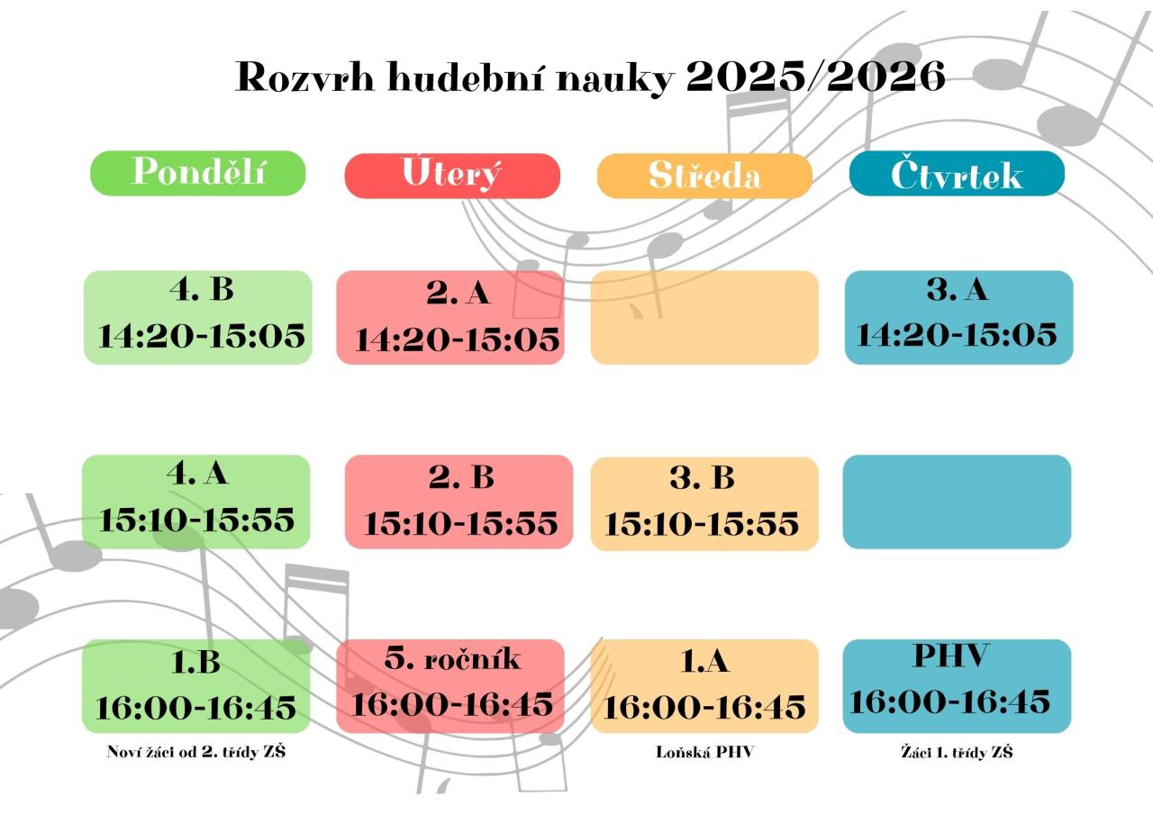 S potěšením oznamujeme, že rozvrh hudební nauky pro školní rok 2025/2026 je nyní k dispozici. Výuka hudební nauky bude zahájena v týdnu od 8. září.